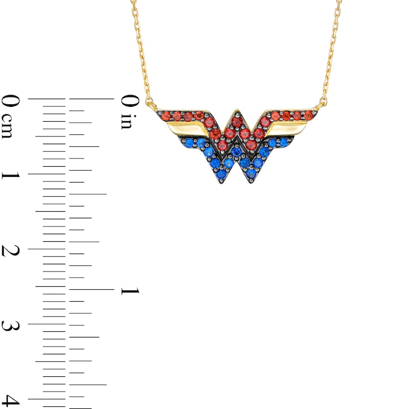 Crafted in warm 10K gold, this eye-catching design features bright blue sapphires and regal garnets bringing color to the classic "WW" logo. Buffed to a brilliant buffed luster, this look suspends centered along a 15.0-inch cable chain with 2.0-inch extender that secures with a spring-ring clasp.This exclusive fine jewelry collection inspires you to wear your strength, confidence and power.